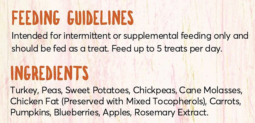 Turkey, Peas, Sweet Potatoes, Chickpeas, Cane Molasses, Chicken Fat (Preserved with Mixed Tocopherols), Carrots, Pumpkins, Apples, Blueberries, Rosemary Extract.