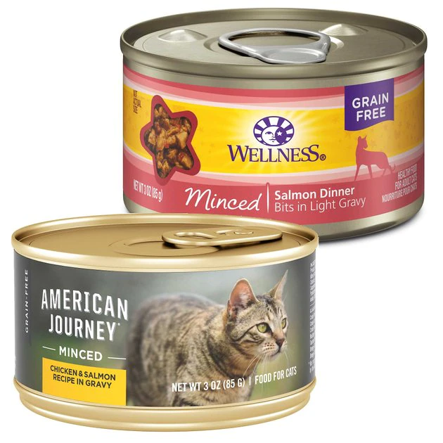 - Each purchase comes with American Journey Minced Chicken & Salmon Recipe in Gravy Grain-Free Canned Cat Food & Wellness Complete Health Natural Minced Salmon Dinner Grain-Free Canned Cat Food.