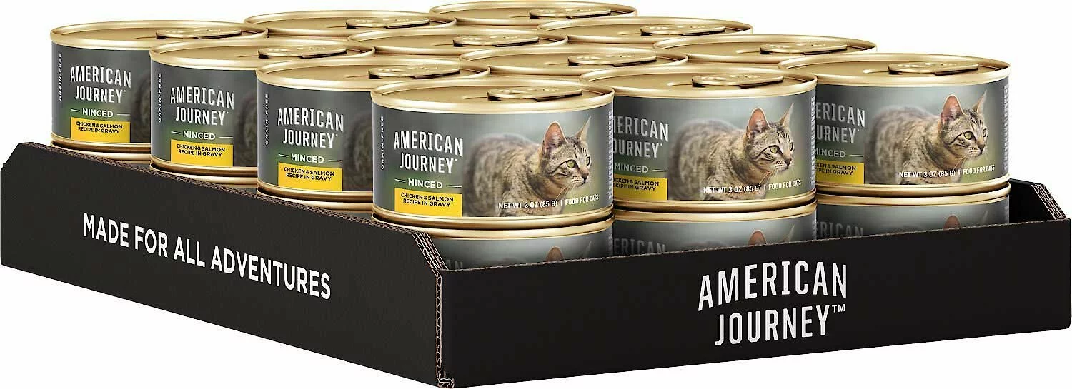 - American Journey Minced Chicken & Salmon Recipe in Gravy Grain-Free Canned Cat Food features bites of real salmon in gravy for the flavor cats naturally crave.