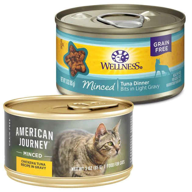 - Each purchase comes with American Journey Minced Chicken & Tuna Recipe in Gravy Grain-Free Canned Cat Food & Wellness Minced Tuna Dinner Grain-Free Canned Cat Food.