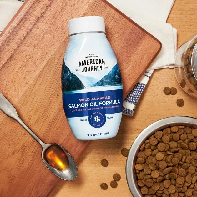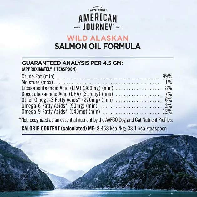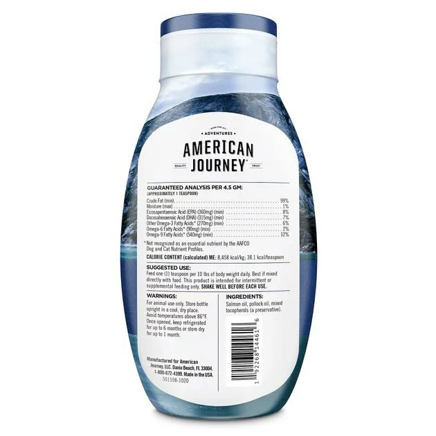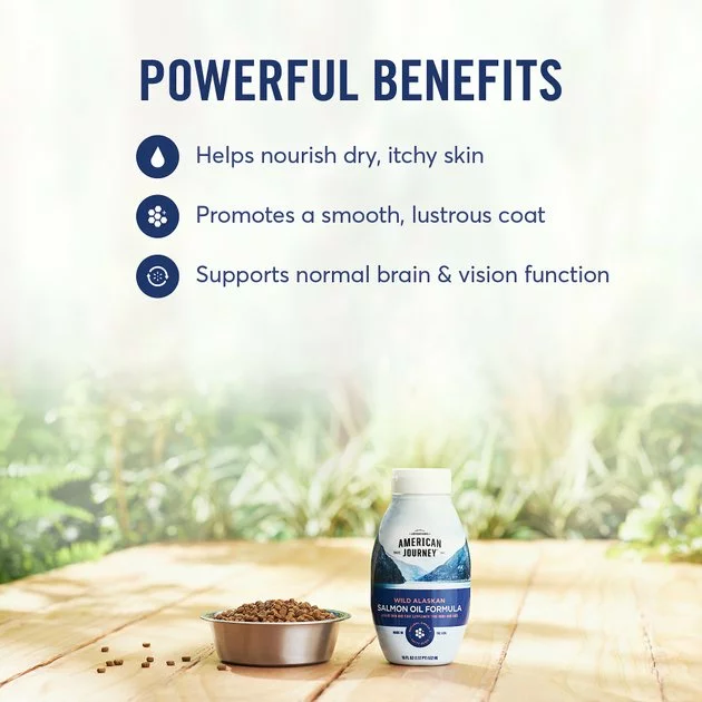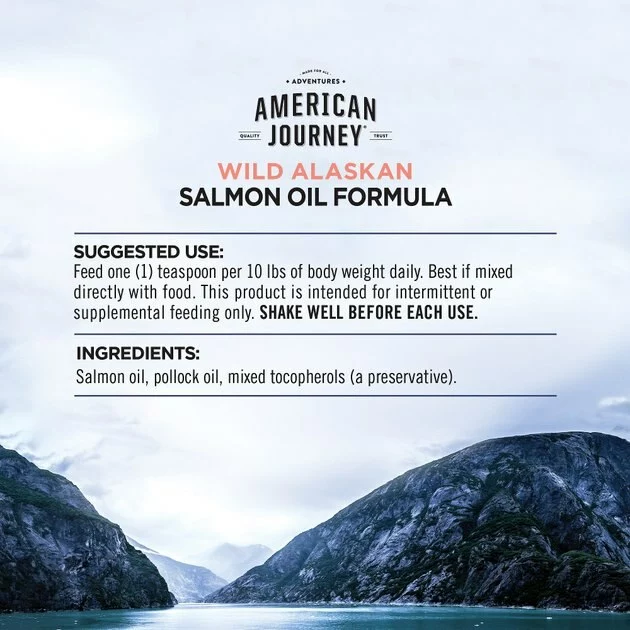 Give your pet’s meals a delicious, nutritious boost for their skin and coat health with American Journey Wild Alaskan Salmon Oil Formula Liquid Dog & Cat Supplement. Made with a 51/49% blend of oils from wild-caught Alaskan salmon and pollock, this nutritious supplement helps promote skin and coat health with beneficial omega-3 fatty acids like DHA and EPA, which help nourish dry, sensitive skin. These long-chain omegas are also known to help support healthy brain and vision function in dogs and cats as well. Available in a convenient squeeze bottle with a drip-free cap to help control messes, you can easily add this supplement to your pet’s every meal for a boost of flavor and nutrition. Your pets are sure to love the tasty flavor, and you’ll love all the benefits too.